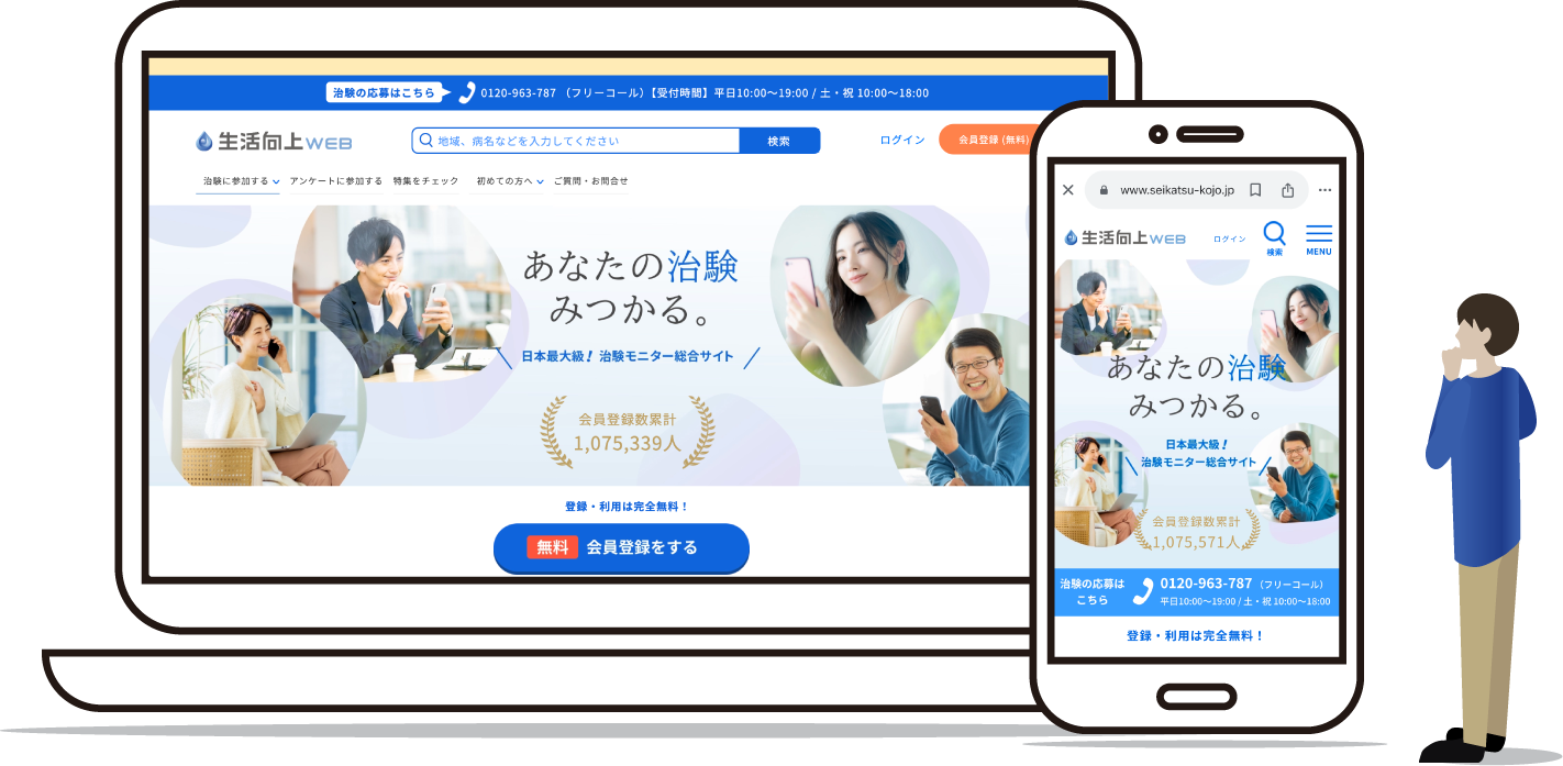 また、二重盲検という方法を採用しており、治験に参加している間は、ご自身にも、治験を担当する医師・スタッフにも、どちらの治験薬を使っているか分からないようになっています。