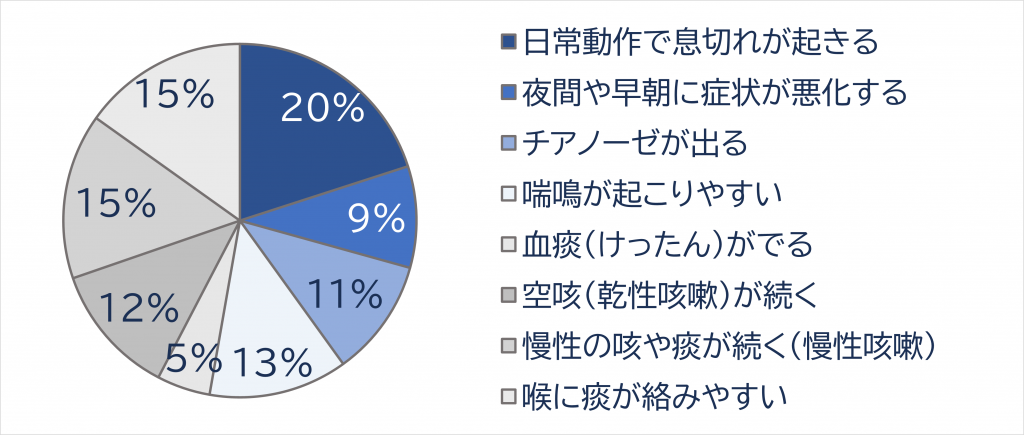 これらの中で、COPDの症状としてよく見られるのは「1. 日常動作で息切れが起きる」「7. 慢性の咳や痰が続く」「8. 喉に痰が絡みやすい」の3つ、そしてCOPDが悪化した際に「3. チアノーゼが出る」が見られます。